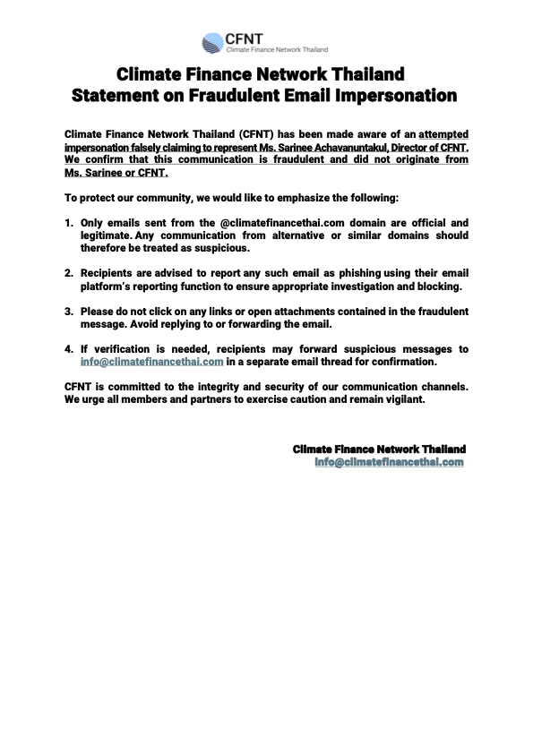 Climate Finance Network Thailand (CFNT) has been made aware of an attempted impersonation falsely claiming to represent Ms. Sarinee Achavanuntakul, Director of CFNT. We confirm that this communication is fraudulent and did not originate from Ms. Sarinee or CFNT.