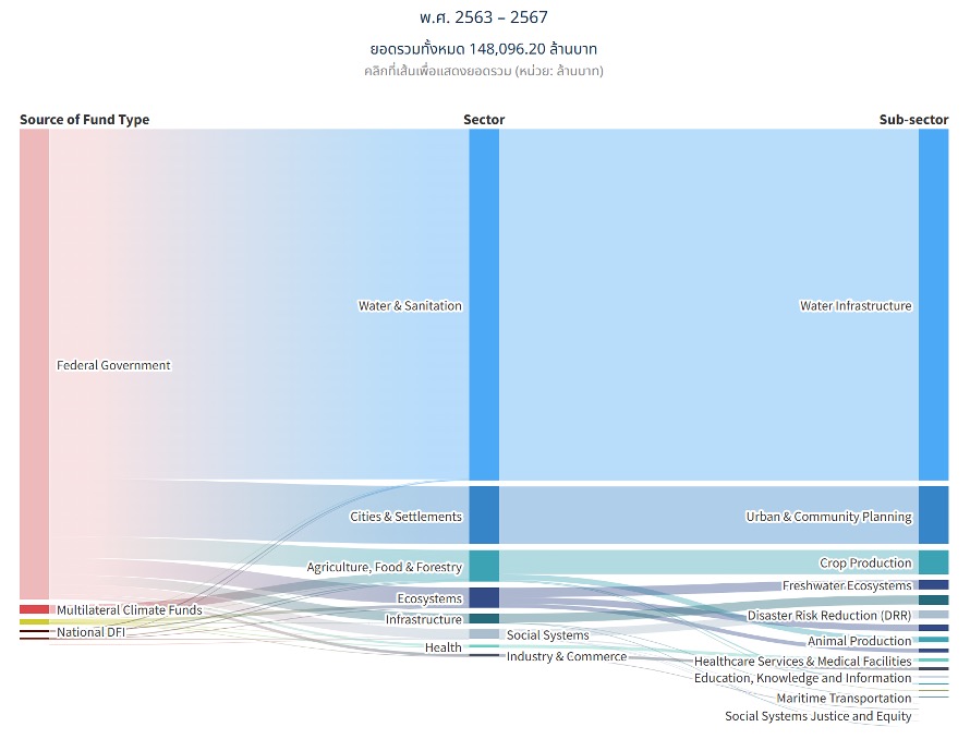 จากรูปที่ 3 การติดตาม adaptation finance ในประเทศไทยภายใต้เครื่องมือ adaptation finance tracker นำเสนอในรูปแบบของแผนภูมิแซงกี้ (Sankey chart)  ซึ่งแสดงการจัดสรรทรัพยากร เช่น งบประมาณ หรือเงินทุน ตั้งแต่ต้นทางไปยังปลายทาง ซึ่งสอดคล้องกับการวิเคราะห์การจัดสรร adaptation finance ในระดับประเทศ  โดยความกว้างของเส้นใน Sankey chart สะท้อนขนาดของเงินทุนที่ได้รับการจัดสรร ทำให้สามารถระบุได้ว่าโครงการในสาขาหรือสาขาย่อยใดได้รับการจัดสรร adaptation finance มากที่สุด นอกจากนี้ Sankey chart ยังช่วยให้ผู้กำหนดนโยบายสามารถระบุช่องว่างทางด้าน adaptation finance ได้อย่างมีประสิทธิภาพ