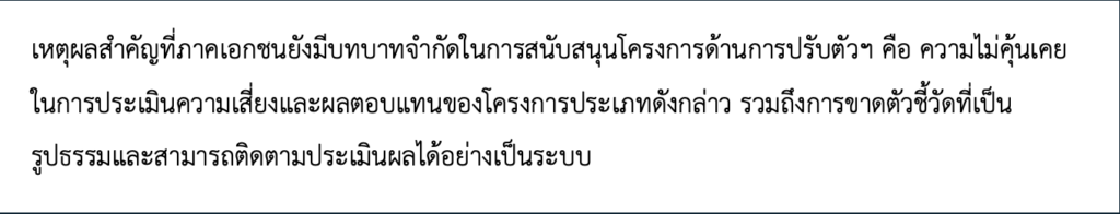 นอกจากนี้ ภาคเอกชนยังมีความกังวลว่าโครงการด้านการปรับตัวฯ ส่วนใหญ่มักเน้นผลลัพธ์ในระยะยาวและมุ่งสร้างประโยชน์สาธารณะมากกว่าผลตอบแทนทางการเงินแก่เอกชนรายใดรายหนึ่ง เช่น การลดความเปราะบางของชุมชนหรือระบบสาธารณูปโภคต่อสภาพอากาศสุดขั้ว ทำให้ยากหรือไม่เหมาะสมต่อการวิเคราะห์กระแสเงินสด (cash flow) และการประเมินความคุ้มค่าในการลงทุนในแบบที่สถาบันการเงินต้องการ อีกทั้ง สถาบันการเงินหลายแห่งยังขาดเครื่องมือหรือความรู้ในการประเมินความเสี่ยงจากการเปลี่ยนแปลงสภาพภูมิอากาศของโครงการด้านการปรับตัวฯ ซึ่งมีลักษณะเฉพาะ แตกต่างจากโครงการด้านการลดการปล่อยก๊าซเรือนกระจกที่มีโมเดลธุรกิจและผลตอบแทนทางการเงินจากการลงทุน (อาทิ จากการประหยัดค่าใช้จ่าย) ที่ชัดเจนกว่า