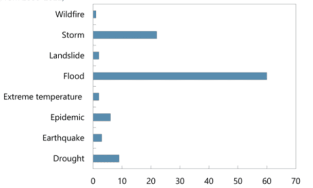 ประเทศไทยเป็นหนึ่งในประเทศที่มีความเสี่ยงสูงต่อภัยพิบัติและสภาพอากาศสุดขั้ว โดยเฉพาะน้ำท่วม พายุหมุนเขตร้อน และภัยแล้ง ซึ่งเกิดขึ้นบ่อยครั้งและสร้างความเสียหายอย่างรุนแรงต่อเศรษฐกิจและสังคม จากข้อมูลของ The International Disaster Database (EM-DAT) ระบุว่า ระหว่างปี 2000–2022 ประเทศไทยประสบภัยพิบัติทางธรรมชาติหลากหลายประเภทอย่างต่อเนื่อง โดยเฉพาะน้ำท่วมและภัยแล้งที่เกิดซ้ำบ่อยครั้ง (รูปที่ 1) ซึ่งส่งผลต่อชีวิตประชาชนและทรัพย์สินในวงกว้าง